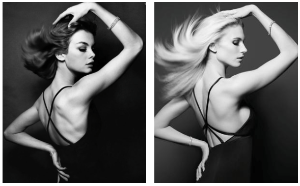 David Bailey always brought great energy, life and charm to his photos. In this original photograph for Vogue, Bailey only used a large piece of cardboard to create the wind demonstrated in her ‘hair flick.’ Rankin re-created this image with his model girlfriend, Tuuli, and used the same techniques to create the hair drop. Both images are similar and leave the emphasis on the models figure, pose and beauty. However, in Baileys original you can almost see the other side of Jeans face as if the lighting is bouncing off her skin and features making the photo look more sharp and rounded were as in Rankin’s, Tuuli could almost pass as a painting.
