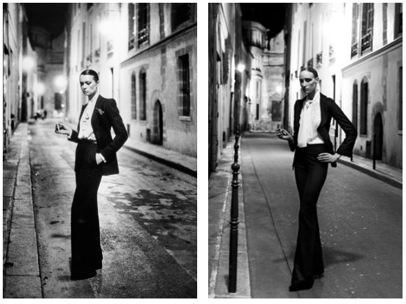 Helmut Newton’s work often includes women in their underwear, or sometimes in the nude, his style empowered women rather than objectifying them. This image, ‘Rue Aubriot’ presented in Vogue, shows off this woman’s height and presents slight masculinity, this could be suggesting the equality between men and women. I like how Rankin has taken this photograph on the exact same street as Newton and has made it clear as to which one is modern and which one is not. In the original picture the street looks quite gloomy and mysterious. In Rankin’s recreated image I can tell it is a model posing for a photograph, it doesn’t look as natural as the original. I believe that this is the best recreation image from the documentary, it is the most exact.