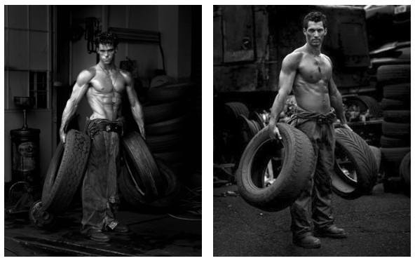 Herb Ritt’s original image transformed how men were viewd in the fashion industry. Following the trend through the 70’s of empowering the sexuality of women, this was then followed by the men of the 80’s. Comparing both images it seems as though Rankin’s photo looks more natural as if he caught Model David Gandy actually at work, rather than him posing. When Rankin recreated his version of the image the contrast was created in post production to reflect Ritt’s photographic style.