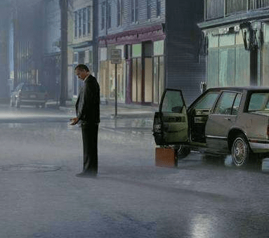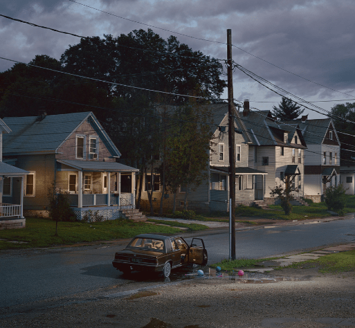 For example, this image features what appears to be an abandoned car with each of its doors open. There is no people in this scene but there are visible lights on in the houses. This leaves viewers curious and asking questions.