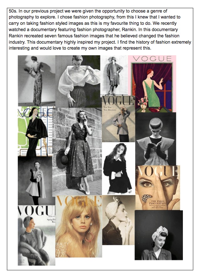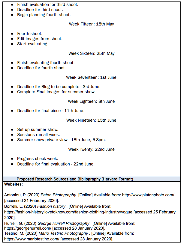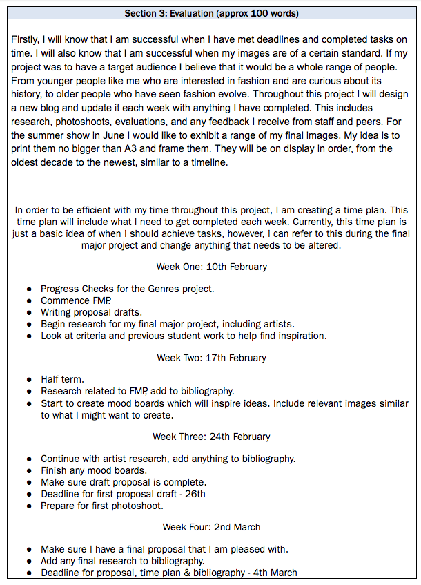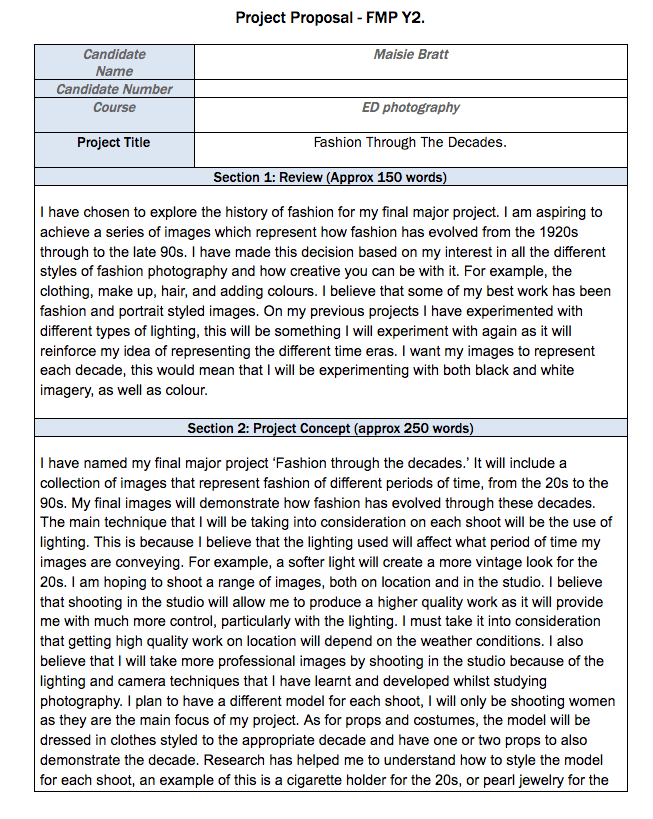 Here is my completed proposal, in the given template. As well as my proposal, I have also included my mood board, which features inspiring images, my time plan, this will help to guide me through this project, and my bibliography, which documents all of the research that I have carried out so far.