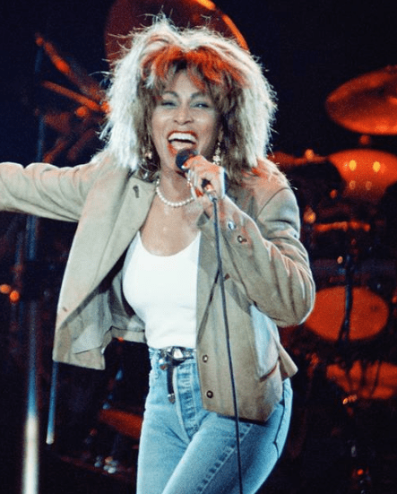 High-waisted jeans became popular in the 80s. Tina Turner pulls this look off with aplomb, along with bauble earrings and a white vest as accessories.